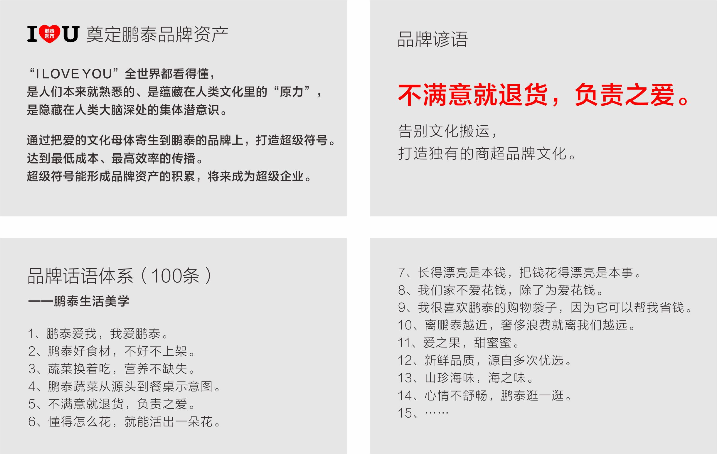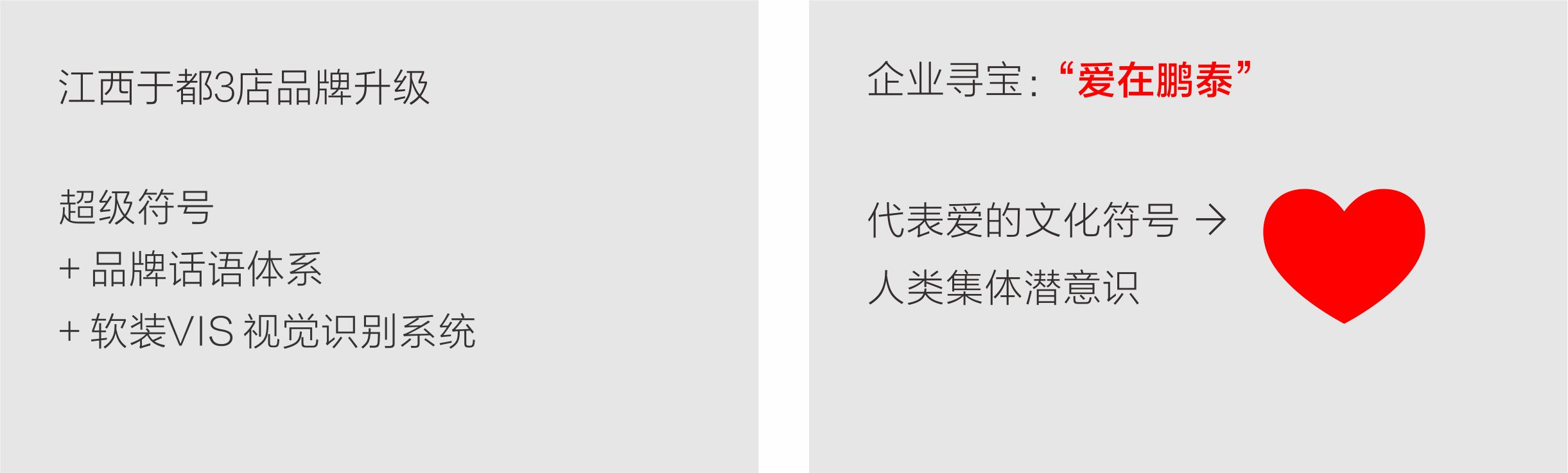 鹏泰品牌升级是通过品牌的三大原理(社会监督原理、品牌成本原理、品牌资产原理)进行创作。用品牌谚语+超级符号+创新设计,在鹏泰原有的经营价值上,企业寻宝,找到价值、重塑价值、放大价值。I LOVE YOU让鹏泰的品牌能够产生品牌资产的积累。